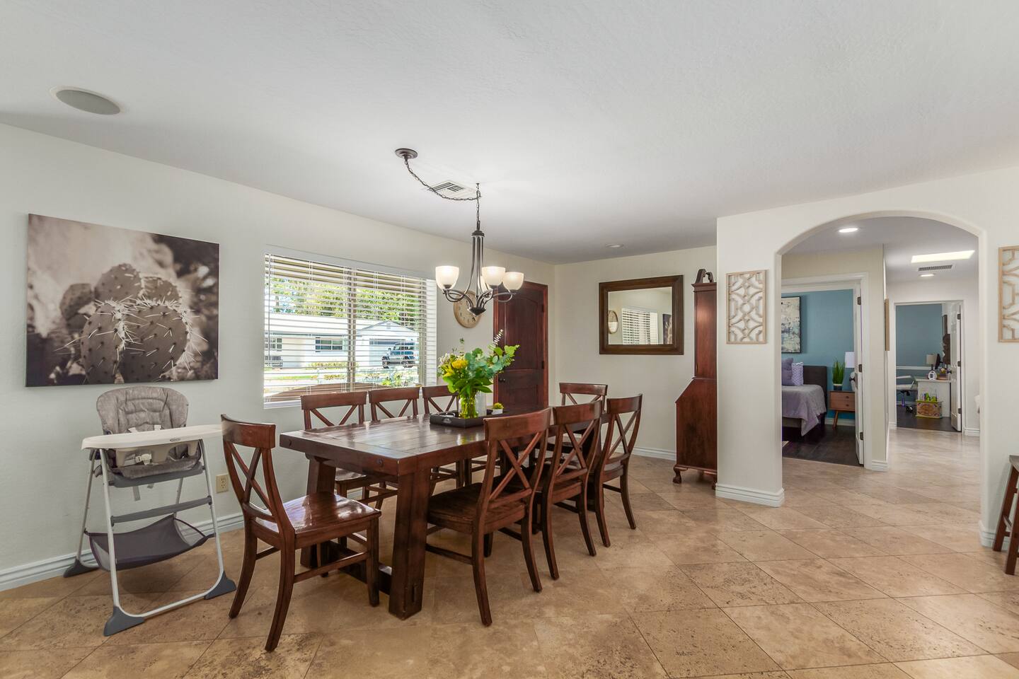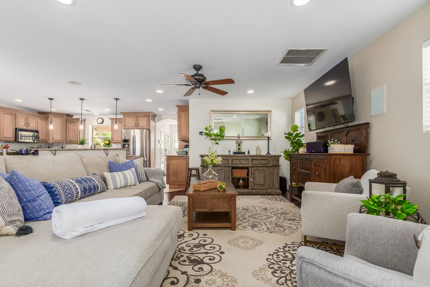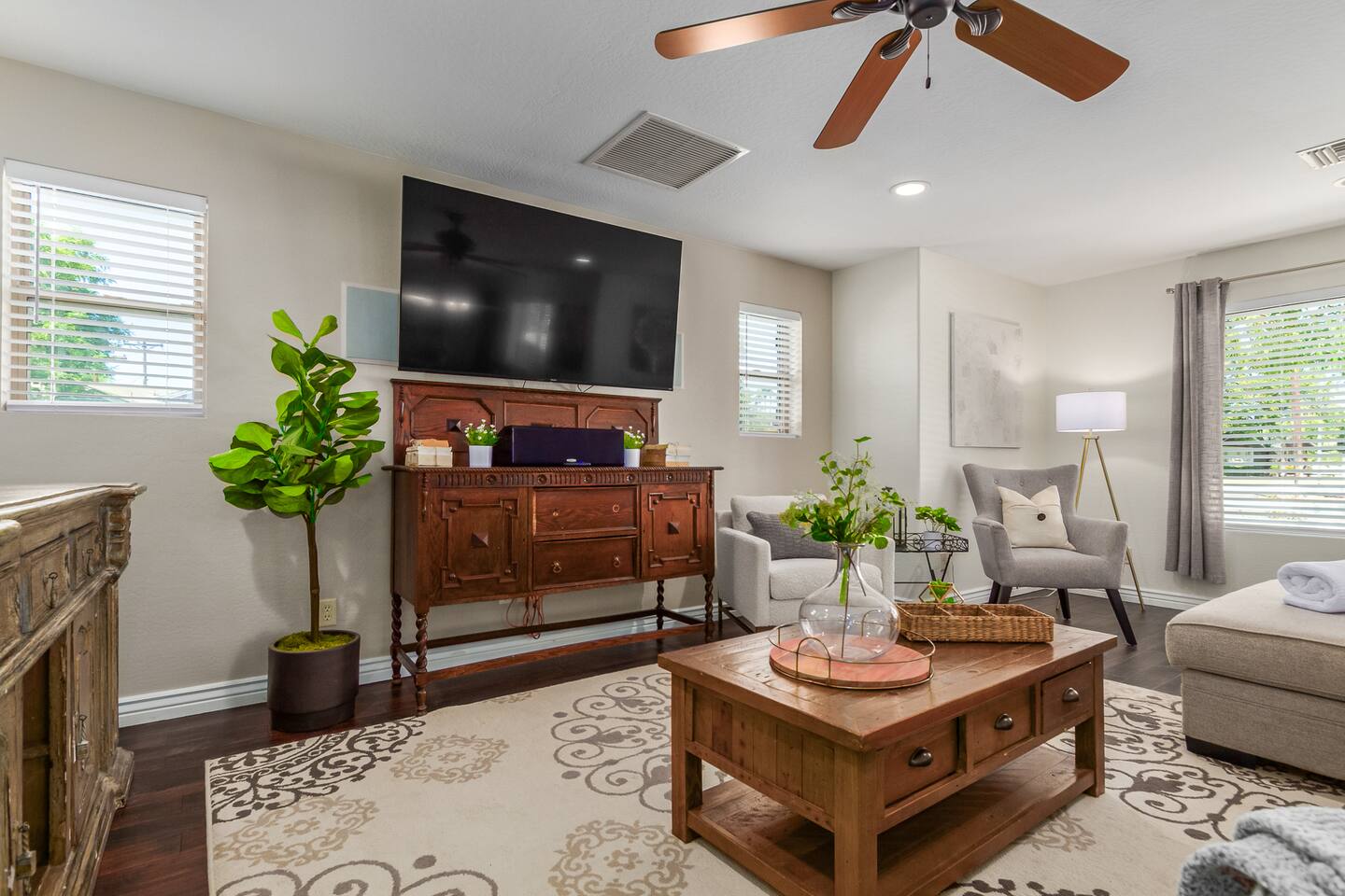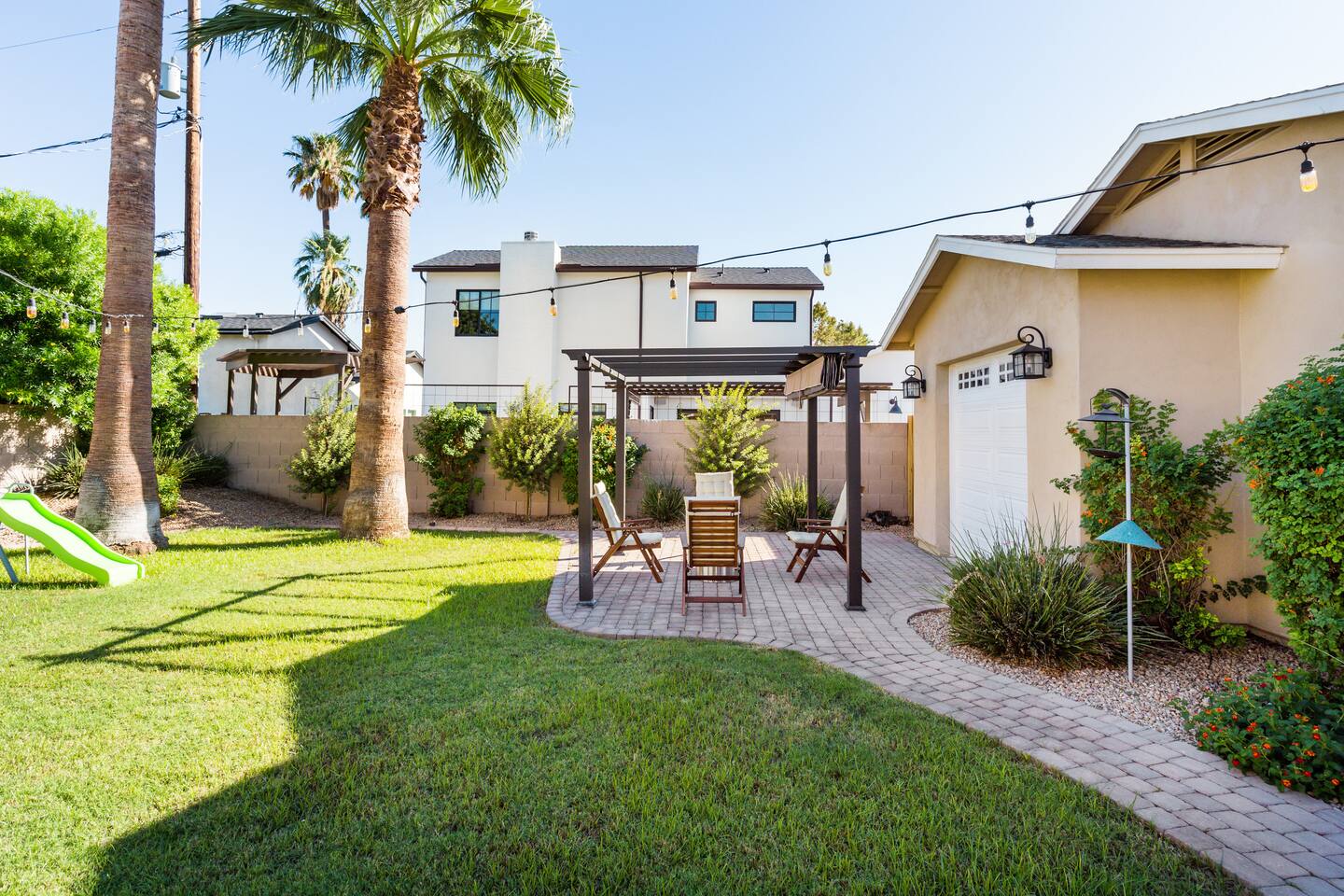 Welcome to your family-friendly retreat near Camelback Mountain and Old Town Scottsdale! Our 2,200-sq-ft single-level home is perfectly designed for comfort, connection, and play — ideal for families with young children or grandparents hosting grandkids. Inside, enjoy an open great room with a 65" Roku HDTV, cozy sofas, and dining for eight. The chef’s kitchen features stainless appliances, plenty of fridge space, a wine fridge, Keurig, and full cookware — everything you need for home-cooked meals. Two bedrooms offer plush king memory-foam beds and smart TVs, while the third serves as a kids’ haven with a bunk bed double/twin, full-size crib, toys, children’s books, and a workspace. A den adds a sofa bed and additional TV for extra flexibility. The master suite includes a walk-in closet, dual-sink bath, soaking tub, and French doors leading outside. A full guest bath, powder room, and laundry room round out the layout. Outdoors, families love the enclosed ranch-rail front yard — perfect for safe play while you relax on the porch with Camelback views. The backyard offers a covered patio, comfortable seating, ceiling fan, BBQ, and a swing set for kids (up to 70 lbs). Every stay includes baby essentials (crib, high chair, bath seat), 1 Gbps fast Wi-Fi, Roku streaming, and hotel-quality linens. Quiet, walkable neighborhood — minutes to hiking, golf, dining, and PHX Airport.